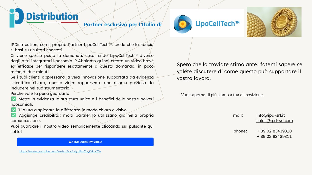 IPDistribution, con il proprio Partner LipoCellTech™, crede che la fiducia si basi su risultati concreti. Ci viene spesso posta la domanda: cosa rende LipoCellTech™ diverso dagli altri integratori liposomiali? Abbiamo quindi creato un video breve ed efficace per rispondere esattamente a questa domanda, in poco meno di due minuti. Se i tuoi clienti apprezzano la […]