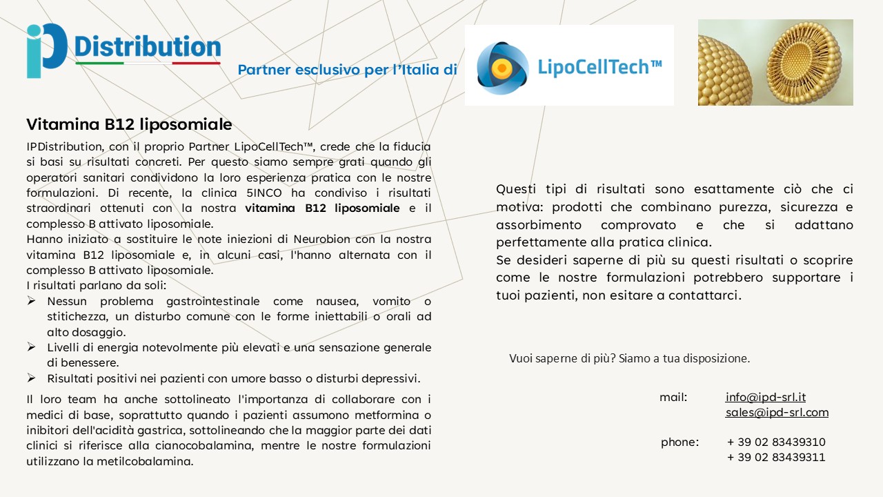 IPDistribution, con il proprio Partner LipoCellTech™, crede che la fiducia si basi su risultati concreti. Per questo siamo sempre grati quando gli operatori sanitari condividono la loro esperienza pratica con le nostre formulazioni. Di recente, la clinica 5INCO ha condiviso i risultati straordinari ottenuti con la nostra vitamina B12 liposomiale e il complesso B attivato […]